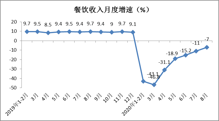 1-8月份,餐饮收入21510亿元,同比下降26.6%,降幅较1-7月份收窄3个百分点。其中,8月份餐饮收入3619亿元,同比下降7%,降幅环比收窄4个百分点。