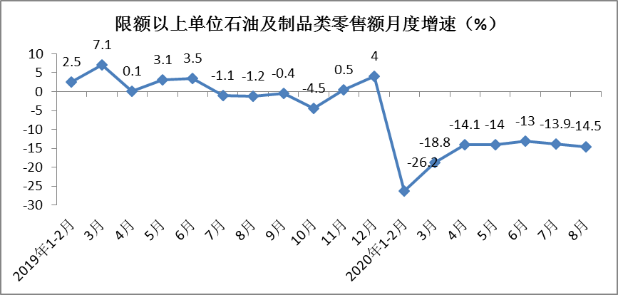 1-8月份,限额以上单位石油及制品类零售额实现10702亿元,同比下降17.3%,降幅较1-7月份收窄0.5个百分点。其中8月份石油及制品零售额同比下降14.5%,降幅环比扩大0.6个百分点。