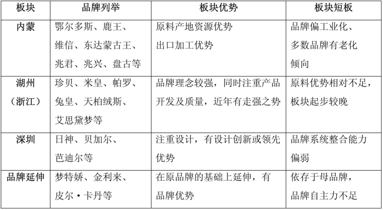 这些品牌大家在平时都有接触过,主要涵盖五大板块里面,内蒙主要是原料优势,代表的品牌是鄂尔多斯;其次是浙江湖州也形成了羊绒板块;再次是深圳,这个板块的品牌主要是强调设计方面;还有一些是品牌延伸的板块,像皮尔卡丹等也依托主品牌涉及到羊绒行业。