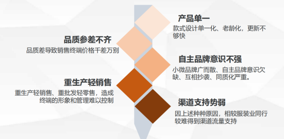 羊绒行业发展到今天优势很明显,但缺点也很突出,主要表现在五个方面:第一,产品单一,因为采用的原料只有一种就是羊绒,采用针织结构做成的,款式设计很单一,老龄化严重,更新不够快。我们是非常明显的季节性产品,这也给我们带来了很大的困惑。其次,羊绒产品品质参差不齐,羊绒是对技术要求非常高的行业,品质在市场上参差不齐,导致羊绒价格在终端千差万别。第三,自主品牌意识不强。品牌发展到现在也形成了很多小微品牌,小品牌发展广而散,自主品牌一直不强,相互抄袭,同质化非常严重。第四,羊绒行业发展过程中,因为最初是从原料开始的,重生产而轻销售,这带来了很大弊端。在终端形象管理方面很难控制。第五,由于上述种种原因,相较于服装业同行较难得到渠道流量支持。