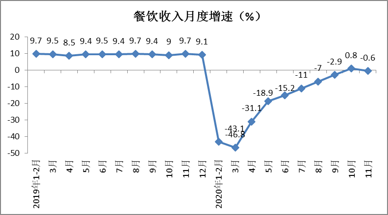 1-11月份,餐饮收入34578亿元,同比下降18.6%,降幅较1-10月份收窄2.4个百分点。其中,11月份餐饮收入4980亿元,同比下降0.6%,增速环比回落1.4个百分点。