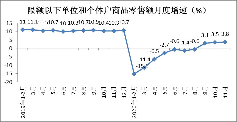 据测算,1-11月份限额以下单位和个体户商品零售额实现196981亿元,同比下降3.7%,降幅较1-10月份收窄0.8个百分点。限额以下单位和个体户商品零售额占商品零售总额的比重为62.2%,较1-10月份下降0.4个百分点。其中,11月份限额以下单位和个体户商品零售额同比增长3.8%,增速环比提高0.3个百分点。
