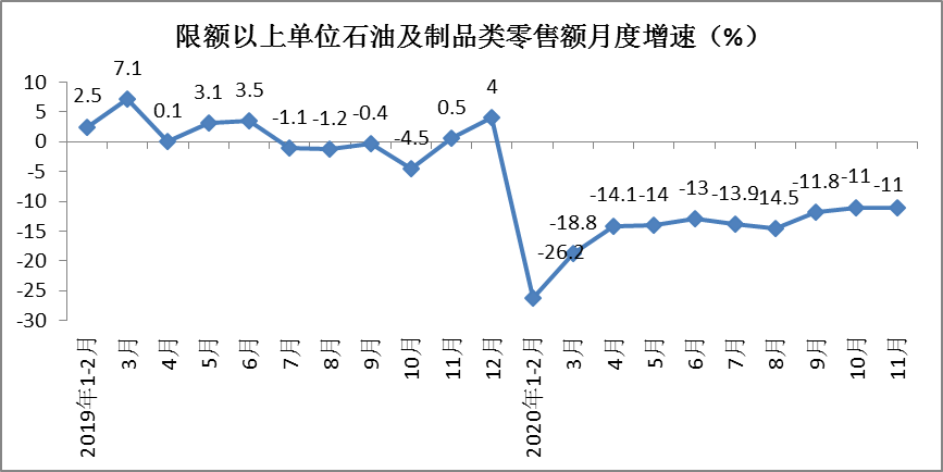 1-11月份,限额以上单位石油及制品类零售额实现15323亿元,同比下降15.6%,降幅较1-10月份收窄0.5个百分点。其中11月份石油及制品零售额同比下降11%,降幅与上月持平。