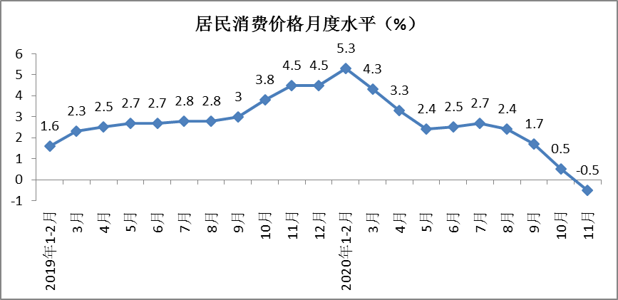 1-11月份,全国居民消费价格同比上涨2.7%,涨幅较上年同期回落0.1个百分点,较1-10月份回落0.3个百分点。其中,食品价格上涨11.5%,涨幅较上年同期提高3个百分点,较1-10月份回落1.5个百分点;非食品价格上涨0.4%,涨幅较上年同期缩小1个百分点,与1-10月份持平。消费品价格上涨3.9%,涨幅较上年同期提高0.5个百分点;服务价格上涨0.6%,涨幅较上年同期收窄1.2个百分点。其中,11月份居民消费价格同比下降0.5%,增速环比回落1个百分点。