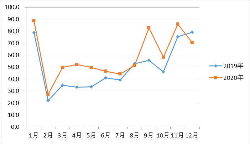 图表 3? 2019、2020年重点线上平台零食市场月度销售额走势[2]