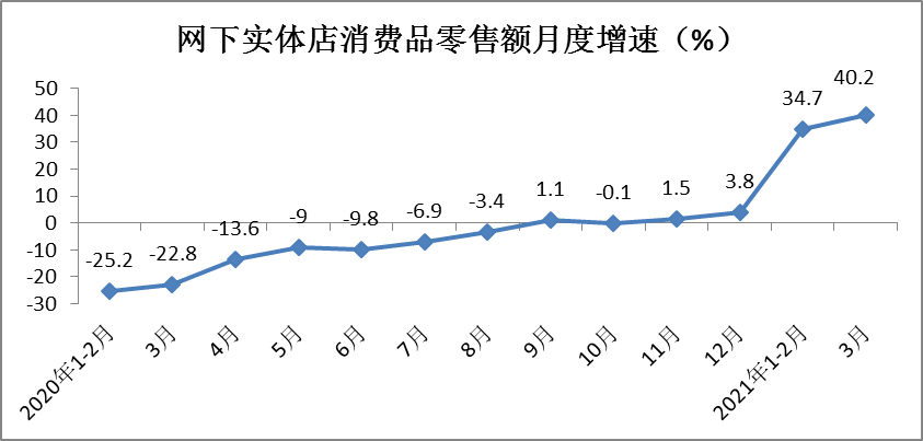 根据测算,一季度实体店消费品零售额同比增长36.4%,较2019年同期增长3.3%,两年平均增长1.6%,增速较1-2月份加快1.7个百分点。其中,限额以上零售业实体店商品零售额同比增长42.2%,两年平均增长4.5%。
