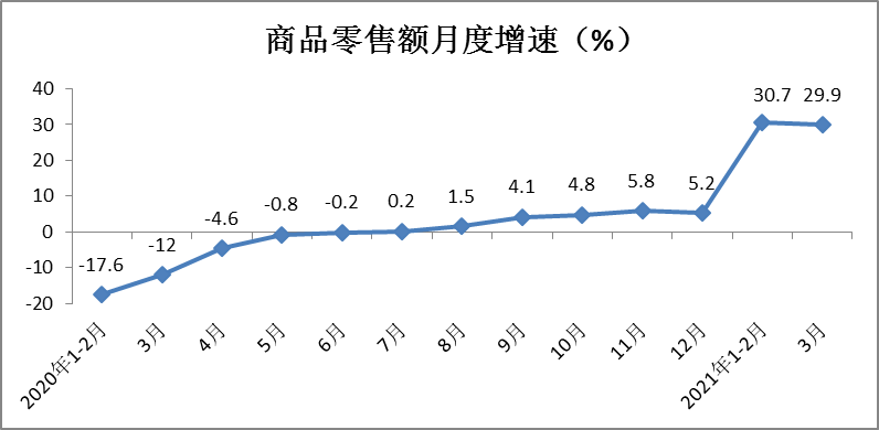 一季度城镇消费品零售额91345亿元,同比增长34.6%,据测算,较2019年同期增长8.8%,两年平均增长4.3%;乡村消费品零售额13875亿元,同比增长29.4%,据测算,较2019年同期增长6.5%,两年平均增长3.2%。