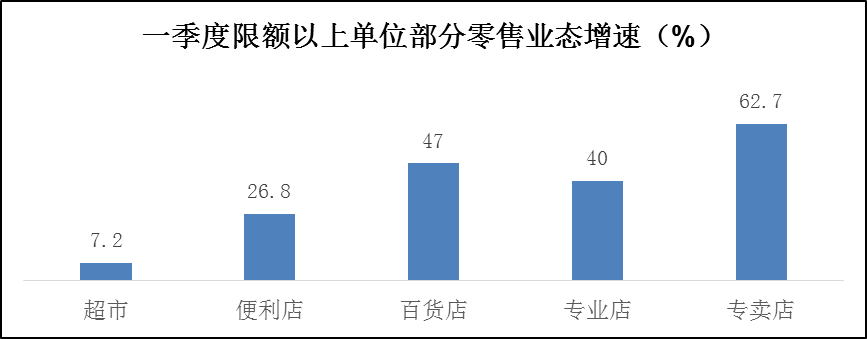 一季度限额以上零售业单位中的超市、便利店、百货店、专业店和专卖店零售额同比分别增长7.2%、26.8%、47%、40%和62.7%。