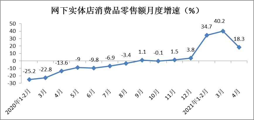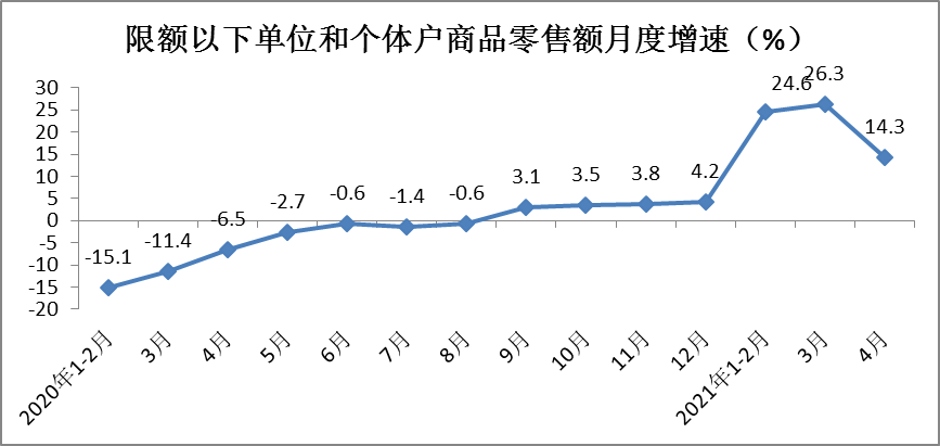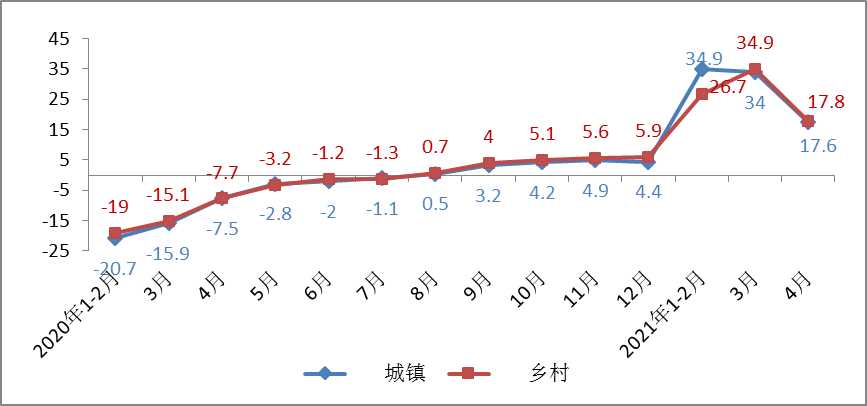 1—4月份,城镇消费品零售额120233亿元,同比增长30.1%,两年平均增长4.3%,两年平均增速与一季度持平;乡村消费品零售额18140亿元,增长26.5%,两年平均增长3.4%,两年平均增速较一季度加快0.2个百分点。