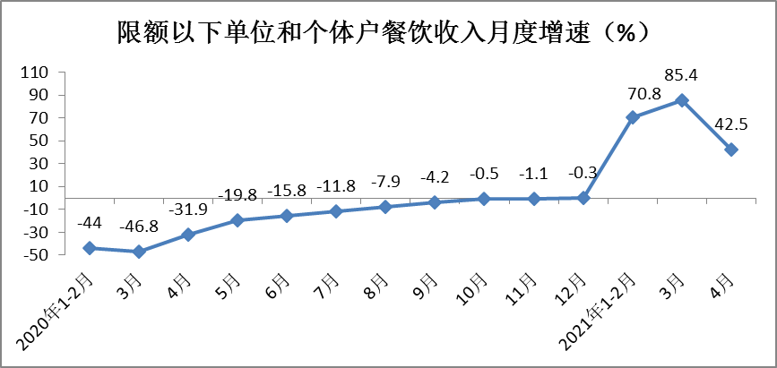 1-4月份,餐饮收入13973亿元,增长67.7%,两年平均下降0.7%,降幅较一季度收窄0.3个百分点。其中,限额以上单位餐饮收入3106亿元,同比增长72.7%,增幅大于餐饮收入整体增幅5个百分点。