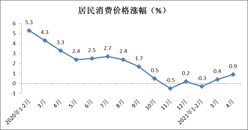 1-4月份全国居民消费价格累计上涨0.2%,涨幅较上年回落4.3个百分点,较一季度提高0.2个百分点。其中食品价格与上年同期持平,涨幅较上年同期回落18.9个百分点,较一季度下降0.2个百分点;非食品价格累计上涨0.2%,涨幅较上年同期回落0.7个百分点,较一季度提高0.3个百分点。消费品价格累计上涨0.3%,涨幅较上年同期回落6.3个百分点,较一季度提高0.2个百分点;服务价格与上年同期持平,涨幅较上年同期回落1个百分点,涨幅较一季度提高0.2个百分点。