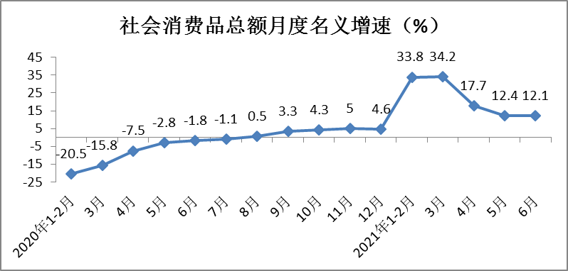 上半年,我国社会消费品零售总额实现211904亿元,较上年同期增长23%,两年平均增速为4.4%,两年平均增速较1-5月份加快0.1个百分点。其中,除汽车以外的消费品零售额189997亿元,增长22.2%,增速较1-5月份放缓2.2个百分点。6月份,我国社会消费品零售额37586亿元,同比增长12.1%,增速环比放缓0.3个百分点;和2019年同期相比,增长10%,增速环比加快0.7个百分点(与2021年5月份较2019年5月份增长速度相比);两年平均增速为4.9%,增速环比加快0.4个百分点。