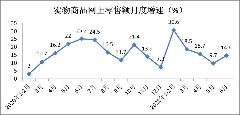 上半年,实物商品网上零售额实现50263亿元,同比增长18.7%,两年平均增长16.5%,两年平均增速较1-5月份加快2.3个百分点。上半年,实物商品网上零售额占社会消费品零售总额的比重为23.7%,占比较1-5月份提高1.1个百分点。其中,吃类、穿类和用类商品分别增长23.5%、24.1%和16.7%,两年平均分别增长30.9%、9.8%和17.0%。经测算,6月份实物商品网上零售额实现10886亿元,同比增长14.6%,增速环比加快4.9个百分点。