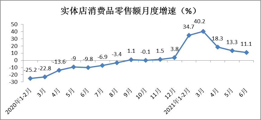 根据测算,上半年实体店消费品零售额161641亿元,同比增长24.4%,较2019年同期增长2.7%,两年平均增长1.3%,两年平均增速较1-5月份放缓0.3个百分点。上半年,限额以上零售业单位中的超市、便利店、百货店、专业店和专卖店零售额同比分别增长6.2%、17.4%、29.5%、24.6%和32.4%。6月份实体店消费品零售额26700亿元,同比增长11.1%,增速环比放缓2.2个百分点。