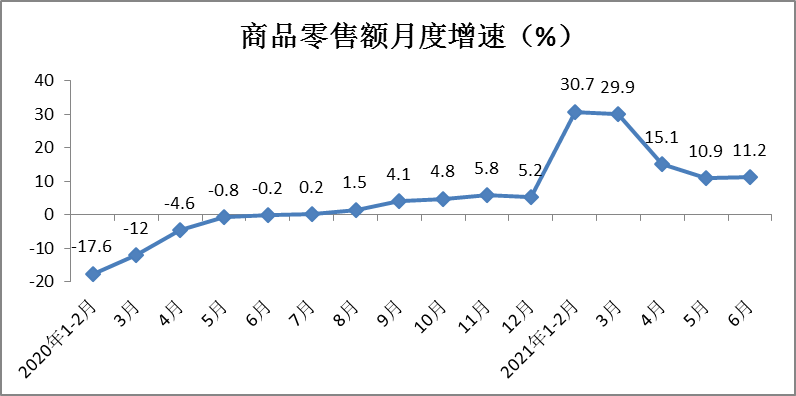 上半年,商品零售190192亿元,同比增长20.6%,两年平均增长4.9%,两年平均增速较1-5月份加快0.1个百分点。其中,限额以上单位商品零售73994亿元,同比增长24.8%,增速较1-5月份放缓3.3个百分点。其中,6月份商品零售同比增长11.2%,增速环比加快0.3个百分点。