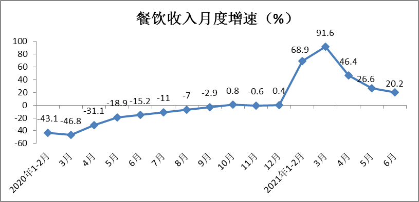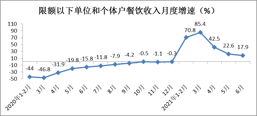 上半年,餐饮收入21712亿元,同比增长48.6%,规模与2019年上半年持平。其中,限额以上单位餐饮收入4945亿元,同比增长56.3%,增速较1-5月份放缓7.9个百分点。其中,6月份餐饮收入3923亿元,同比增长20.2%,增速环比放缓6.4个百分点。
