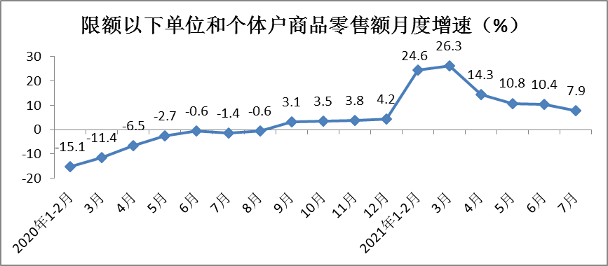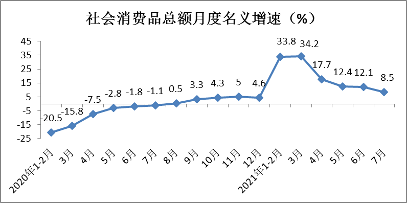 1-7月份,我国社会消费品零售总额实现246829亿元,较上年同期增长20.7%,两年平均增速为4.3%,两年平均增速较1-6月份放缓0.1个百分点。其中,除汽车以外的消费品零售额221631亿元,增长20.2%,增速较1-6月份放缓2个百分点。7月份,我国社会消费品零售额34925亿元,同比增长8.5%,增速环比放缓3.6个百分点;和2019年同期相比,增长7.2%,增速环比放缓2.8个百分点;两年平均增速为3.6%,增速环比放缓1.3个百分点。
