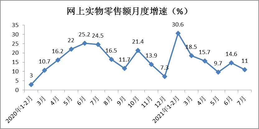 根据测算,1-7月份实体店消费品零售额188699亿元,同比增长21.7%,增速较1-6月份放缓2.7个百分点。7月份实体店消费品零售额27058亿元,同比增长7.8%,增速环比放缓3.3个百分点。