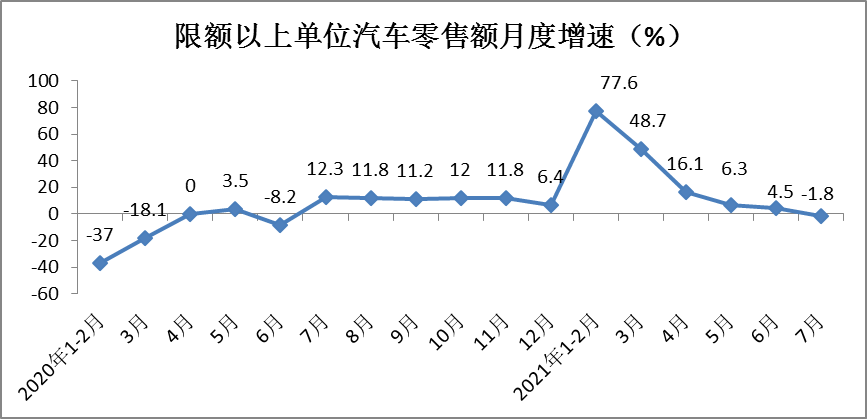 1-7月份,限额以上单位汽车类零售额实现25198亿元,同比增长25%,增速较1-6月份放缓5.4个百分点。7月份,限额以上单位汽车类零售额同比下降1.8%,增速环比下降6.3个百分点。