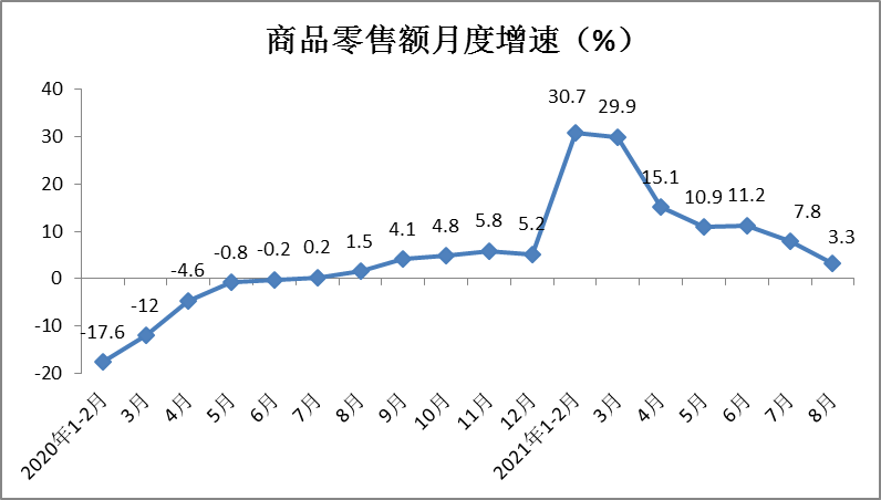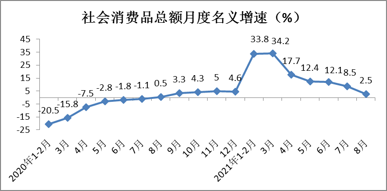 1-8月份,我国社会消费品零售总额实现281224亿元,较上年同期增长18.1%,两年平均增长3.9%,两年平均增速较1-7月份放缓0.4个百分点。其中,除汽车以外的消费品零售额252739亿元,增长17.8%,增速较1-7月份放缓2.4个百分点。8月份,我国社会消费品零售额34395亿元,同比增长2.5%,两年平均增长1.5%,比7月份回落2.1个百分点。