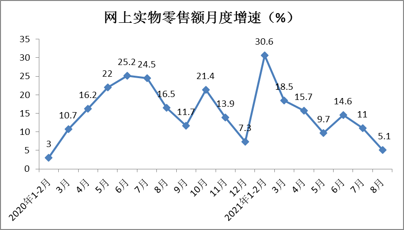 1-8月份,实物商品网上零售额实现66340亿元,同比增长15.9%,增速较1-7月份放缓1.7个百分点。1-8月份,实物商品网上零售额占社会消费品零售总额的比重为23.6%,占比与上月持平。其中,吃类、穿类和用类商品分别增长22.4%、19.4%和14.2%。经测算,8月份实物商品网上零售额实现8210亿元,同比增长5.1%,增速环比放缓5.9个百分点。