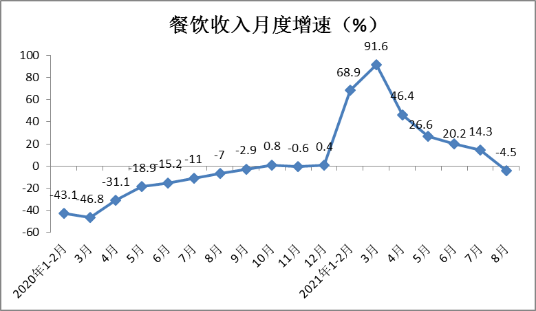 1-8月份,餐饮收入28919亿元,同比增长34.4%,增速较1-7月份放缓7.9个百分点。其中,限额以上单位餐饮收入6632亿元,同比增长40.2%,增速较1-7月份放缓9.3个百分点。其中,8月份餐饮收入3456亿元,同比下降4.5%,增速环比放缓18.8个百分点。
