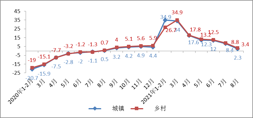 1-8月份,城镇消费品零售额244426亿元,同比增长18.3%,增速较1-7月份放缓2.6个百分点。乡村消费品零售额36798亿元,增长17.2%,增速较1-7月份放缓2.2个百分点。