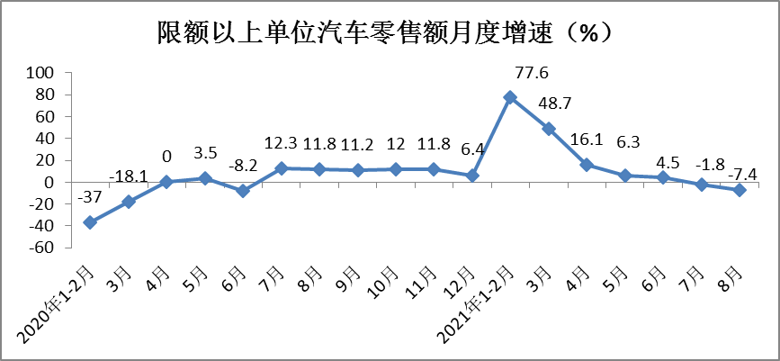 1-8月份,限额以上单位汽车类零售额实现28486亿元,同比增长20.1%,增速较1-7月份放缓4.9个百分点。8月份,限额以上单位汽车类零售额同比下降7.4%,降幅环比扩大5.6个百分点。