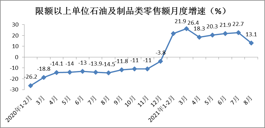 1-8月份,限额以上单位石油及制品类零售额实现13066亿元,同比增长20.7%,增速较1-7月份放缓1.2个百分点。8月份,限额以上单位石油及制品类零售额同比增长13.1%,增速环比放缓9.6个百分点。