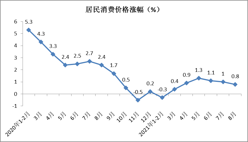 1-8月份,全国居民消费价格同比上涨0.6%,涨幅较上年放缓2.9个百分点,与1-7月份持平。其中食品价格同比下降1.1%,增速较上年同期回落16.3个百分点,较1-7月份下降0.4个百分点;非食品价格同比上涨1%,涨幅较上年同期提高0.5个百分点,较1-7月份提高0.1个百分点。消费品价格同比上涨0.6%,涨幅较上年同期回落4.6个百分点,与1-7月份持平;服务价格同比增长0.6%,涨幅较上年同期回落0.1个百分点,较1-7月份提高0.1个百分点。