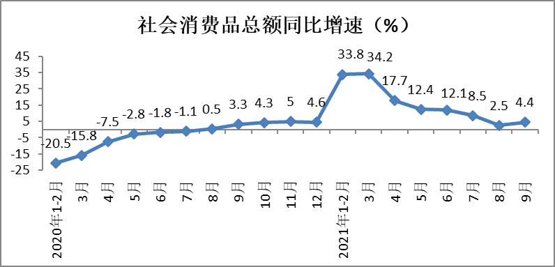 9月份,我国社会消费品零售额36833亿元,较上年同期增长4.4%,增速较8月份加快1.9个百分点。和2019年同期相比,9月份社会消费品零售总额增长7.8%,增速较8月份加快4.8个百分点。