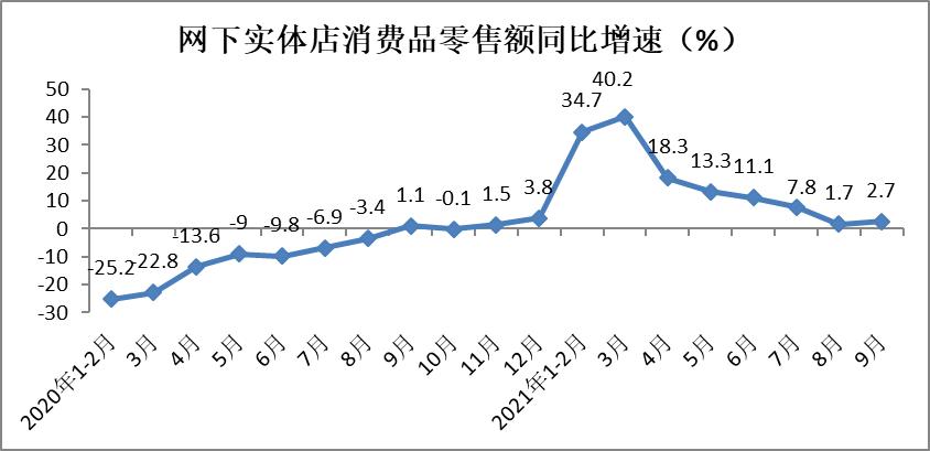 根据测算,前三季度实体店消费品零售额243015亿元,同比增长16.8%,增速较1-8月份放缓2个百分点。9月份实体店消费品零售额28131亿元,同比增长2.7%,增速较8月份加快1个百分点。
