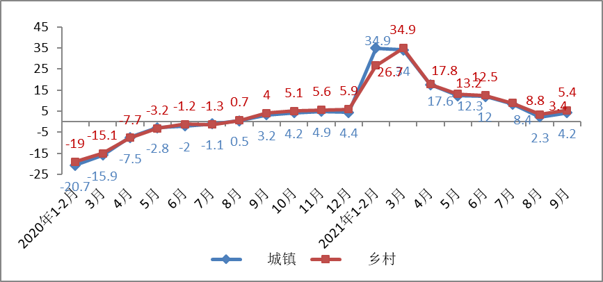 前三季度,城镇消费品零售额275888亿元,同比增长16.5%,增速较1-8月份放缓1.8个百分点。乡村消费品零售额42169亿元,同比增长15.6%,增速较1-8月份放缓1.6个百分点。其中,9月份城镇消费品零售额31462亿元,同比增长4.2%,增速较8月份加快1.9个百分点。乡村消费品零售额5371亿元,同比增长5.4%,增速较8月份加快2个百分点。