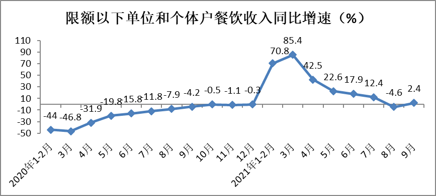 前三季度,餐饮收入32750亿元,同比增长29.8%,增速较1-8月份放缓4.6个百分点。其中,限额以上单位餐饮收入7553亿元,同比增长34.8%,增速较1-8月份放缓5.4个百分点。其中,9月份餐饮收入3831亿元,同比增长3.1%,增速较8月份加快7.6个百分点。