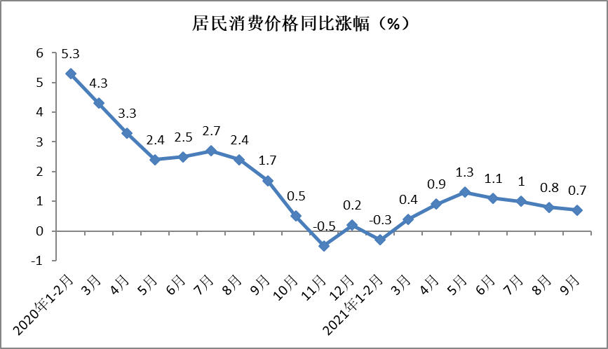 前三季度,全国居民消费价格同比上涨0.6%,涨幅较上年回落2.7个百分点,与1-8月份持平。其中食品价格同比下降1.6%,增速较上年同期回落15.9个百分点,较1-8月份下降0.5个百分点;非食品价格同比上涨1.1%,涨幅较上年同期提高0.6个百分点,较1-8月份提高0.1个百分点。消费品价格同比上涨0.6%,涨幅较上年同期回落4.3个百分点,与1-8月份持平;服务价格同比增长0.7%,涨幅较上年同期提高0.1个百分点,较1-8月份提高0.1个百分点。