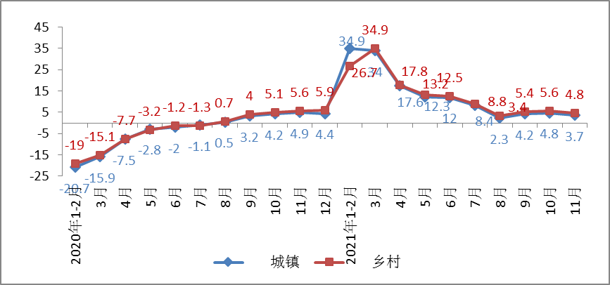 其中,11月份城镇消费品零售额35337亿元,同比增长3.7%,增速较10月份回落了0.9个百分点。乡村消费品零售额5706亿元,同比增长4.8%,增速较10月份回落了0.8个百分点。