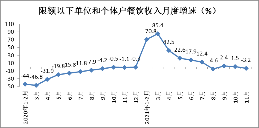 11月份,整体餐饮收入同比下降2.7%,限额以上单位餐饮收入同比下降0.3%。