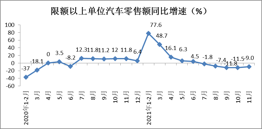 1-11月,限额以上单位汽车类零售额实现39215亿元,累计增长9.7%,增速相较1-10月份放缓2.5个百分点。10月份,汽车类零售额同比下降9.0%,降幅在10月份有所收窄的基础上再次收窄了2.5个百分点。