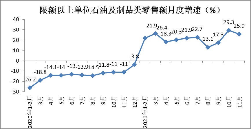 1-11月,限额以上单位石油及制品类零售额实现18843亿元,同比增长21.7%,增速较1-10月放缓0.4个百分点。11月份,限额以上单位石油及制品类零售额同比增长25.9%,增速较10月份回落3.4个百分点。