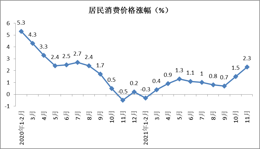 11月份,全国居民消费价格同比上涨2.3%,涨幅较10月份提升0.8个百分点。其中,城市上涨2.4%,农村上涨2.2%;食品价格上涨1.6%,非食品价格上涨2.5%;消费品价格上涨2.9%,服务价格上涨1.5%。