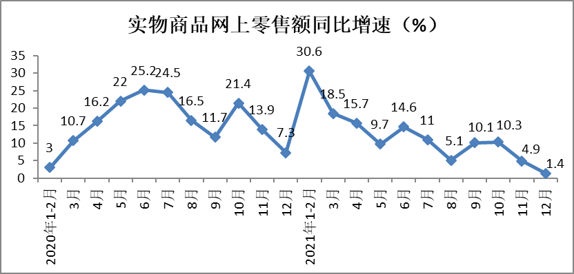 2、2021年实物商品网上零售额增速放缓