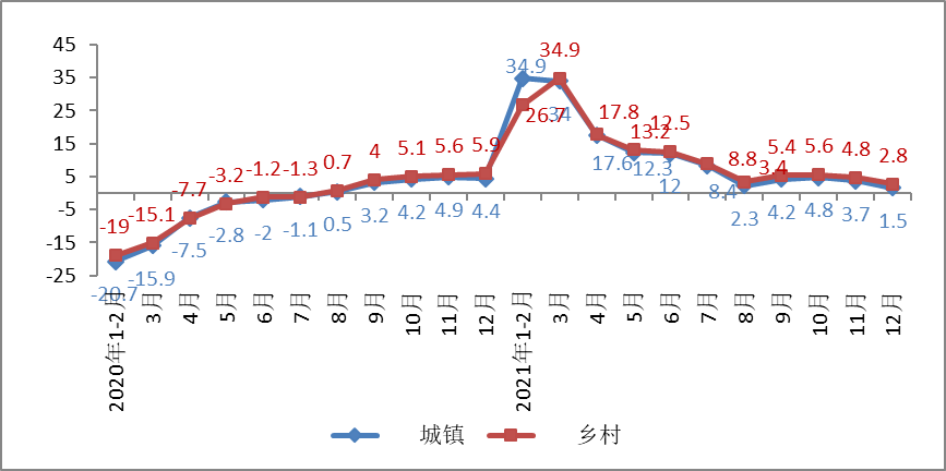 5、2021年城乡消费品市场基本保持同步增长