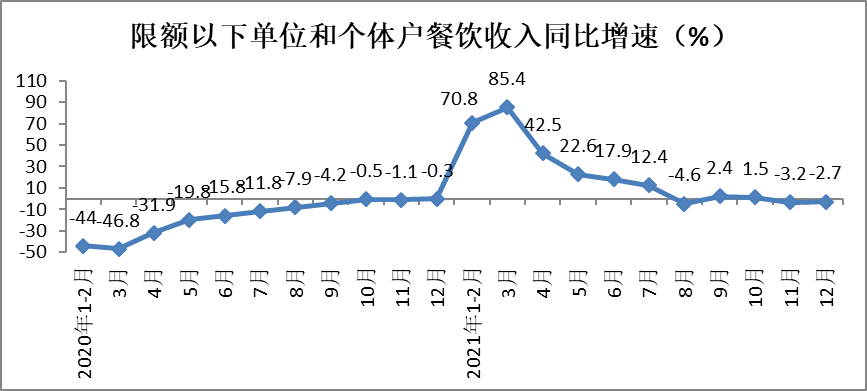 12月份,餐饮收入4841亿元,同比下降2.2%,降幅较11月份收窄0.5个百分点。其中,限额以上单位餐饮收入985亿元,同比下降0.1%,降幅较11月份收窄0.2个百分点。