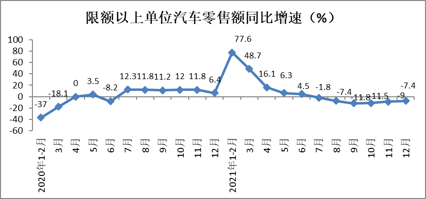 2021年,限额以上单位汽车类零售额实现43787亿元,累计增长7.6%,增速相较1-11月份放缓2.1个百分点。12月份,汽车类零售额同比下降7.4%,降幅较11月份收窄1.6个百分点。