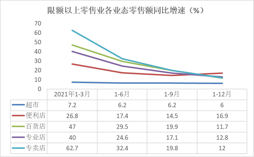 按零售业态分,2021年限额以上零售业单位中的超市、便利店、百货店、专业店和专卖店零售额比上年分别增长6.0%、16.9%、11.7%、12.8%和12.0%。其中,除便利店增速较前三季度加快2.4个百分点外,超市、百货店、专业点、专卖店增速分别较前三季度放缓0.2、8.2、4.3和7.8个百分点。