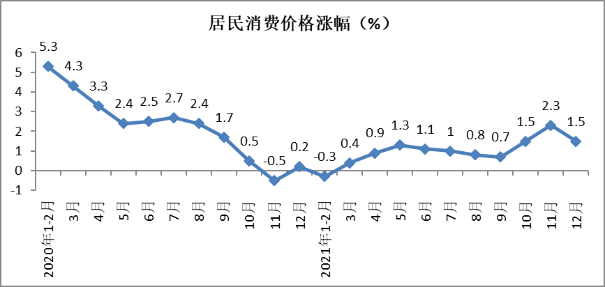 12月份,全国居民消费价格同比上涨1.5%,涨幅较11月份放缓0.8个百分点。