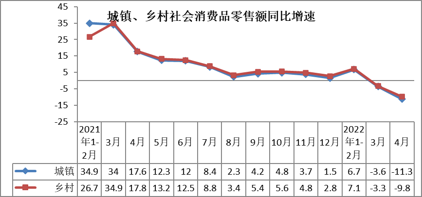 1-4月份,城镇消费品零售额119929亿元,同比下降0.3%,增速较一季度回落3.5个百分点。乡村消费品零售额18213亿元,同比增长0.4%,增速较一季度放缓3.1个百分点。4月份,城镇、乡村消费品零售额同比分别下降11.3%和9.8%,乡村市场降幅相对较低。