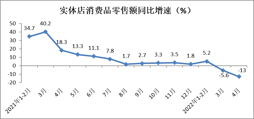 1-4月份,实体店消费品零售额实现105255亿元,同比下降1.8%,增速较一季度回落3.5个百分点。其中,4月份实体店消费品零售额同比大幅下降13%,降幅较上月扩大7.4个百分点,是2020年5月份以来的最大降幅。