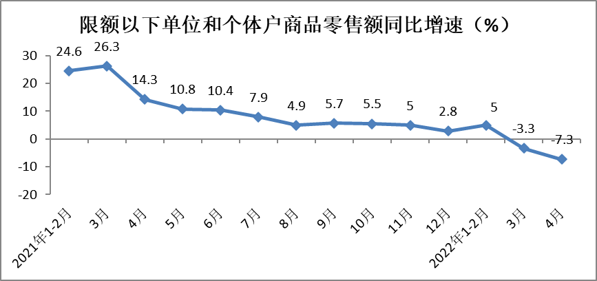 据测算,1-4月份限额以下单位和个体户商品零售额实现76357亿元,与上年同期持平,增速较一季度放缓2.3个百分点。其中,4月份限额以下单位和个体户商品零售额同比下降7.3%,降幅低于限额以上单位6个百分点。