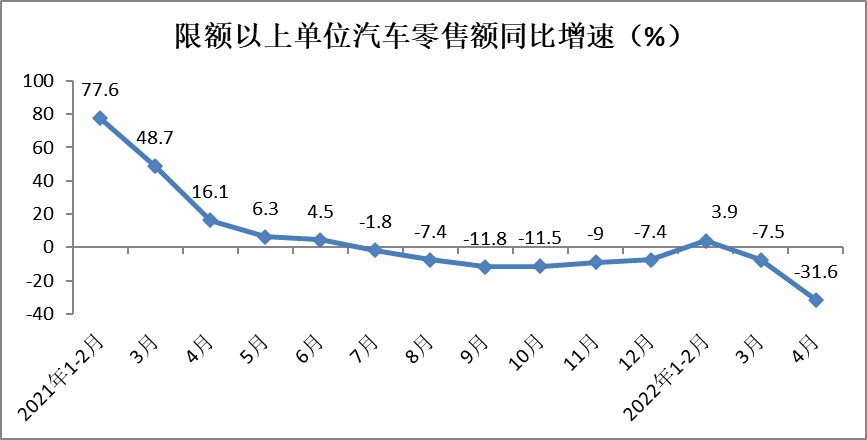 1-4月份,限额以上单位汽车类零售额实现13335亿元,同比下降8.4%,降幅较一季度扩大8.1个百分点。其中,4月份同比下降31.6%,降幅较上月扩大24.1个百分点。